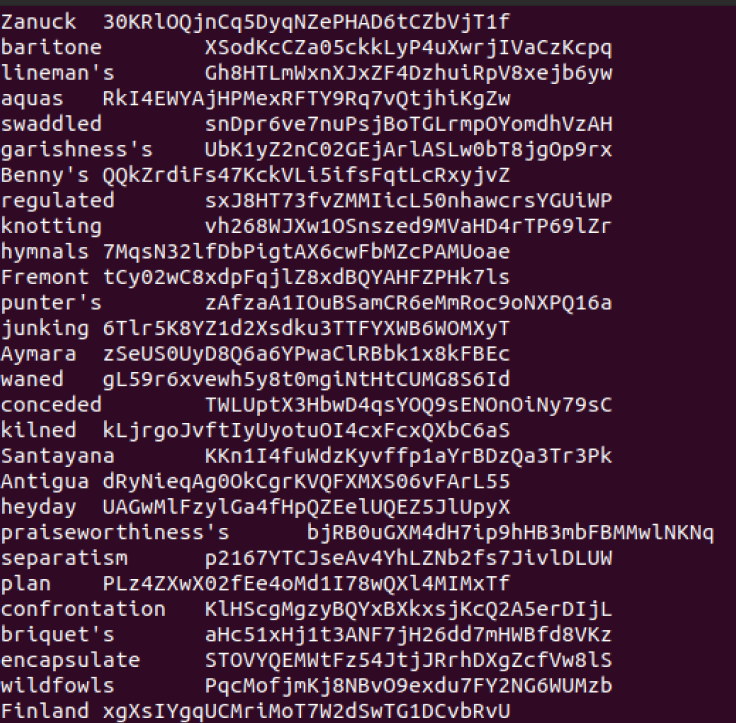 단어들은 왼쪽에 적혀있고, 그 옆에는 비밀번호들이 1:1로 매칭 되어 있다. 라인이 많아서 두 눈으로 찾긴 힘들다!