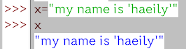 문자열을 쓸 땐 작은따옴표('')나 큰 따옴표("") 상관없이 모두 써줘도 상관없지만 따옴표 안에 또 따옴표를 쓸 때는 다음과 같이 써준다.