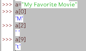 M ~부터 차례대로 글자가 채워지는데, 맨 앞부분에 있는 M은 0번째 자리에 있는 글자이다. 그래서 a[0]을 치면 M이 출력되고, 2번을 출력하면 공백도 같이 출력됨.