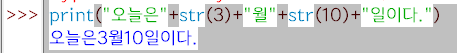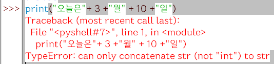 오늘은, 월, 일은 문자로 취급하고, 3과 10은 숫자로 적어주었다. 그런데 print 했더니 오류가 생겨버린 것. 그 이유는 print문에서 +로 연결할 땐 문자열은 문자열끼리만, 숫자는 숫자끼리만 연결할 수 있기 때문이다.