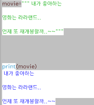 줄 바꿈을 하고 싶을 땐 개행 문자(\n) 또는 따옴표 세 개(''', """)를 작성해준다.