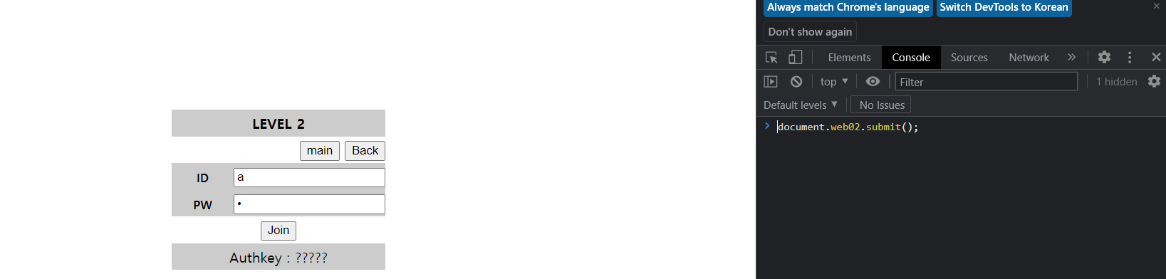 힌트에 나와있는거처럼 ID=PW인 값을 넣어주고 (나는 각각 a를 입력했다.) Console에서 document.web02.submit() 함수를 사용했다. 힌트에선 id=pw이면 문제가 풀리는데, 정작 같게 하면 오류가 생겼고, id와 pw를 다르게 했을 때 제출은 되지만 아무것도 안 뜨기 때문에 두 가지 방법을 섞어서 사용해주었다.