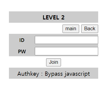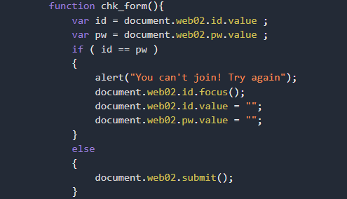 그리고 스크립트에는 이런 내용이 적혀있음. id==pw,, 즉 id랑 pw가 같으면 join이 안된다. id에 아무 값, pw에 아무 값이나 넣어놓고 join 하면 그냥 submit 되면서 새로고침 되고 끝.......