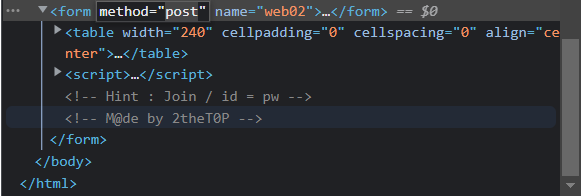 개발자 도구를 열어서 소스코드를 확인했는데, Hint가 적혀있었다. Hint는 Join..이고 id=pw란다.