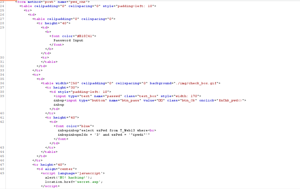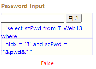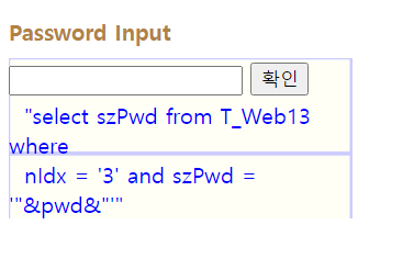 해석을 해보자면 T_Web13이라는 테이블에서 nldx가 3이고, szPwd가 '"&pwd&"'인 것 중에서 szPwd를 출력하면.. 된다는 뜻이다.