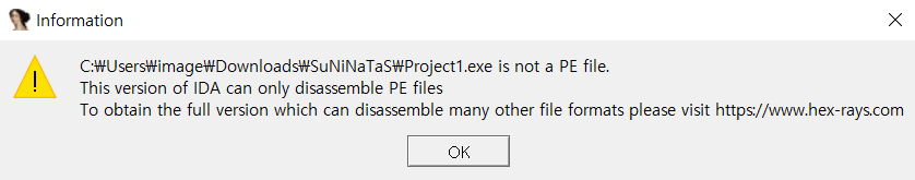 진짜 아무것도 몰라서 일단 IDA를 켰는데 PE 파일이 아니라 분석을 못했다...