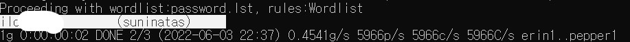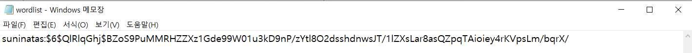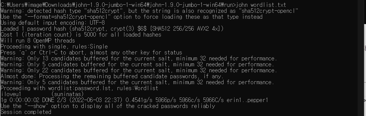 john wordlist.txt라고 입력해주면 존더리퍼 툴이 wordlist.txt의 해시값을 계산해준다.