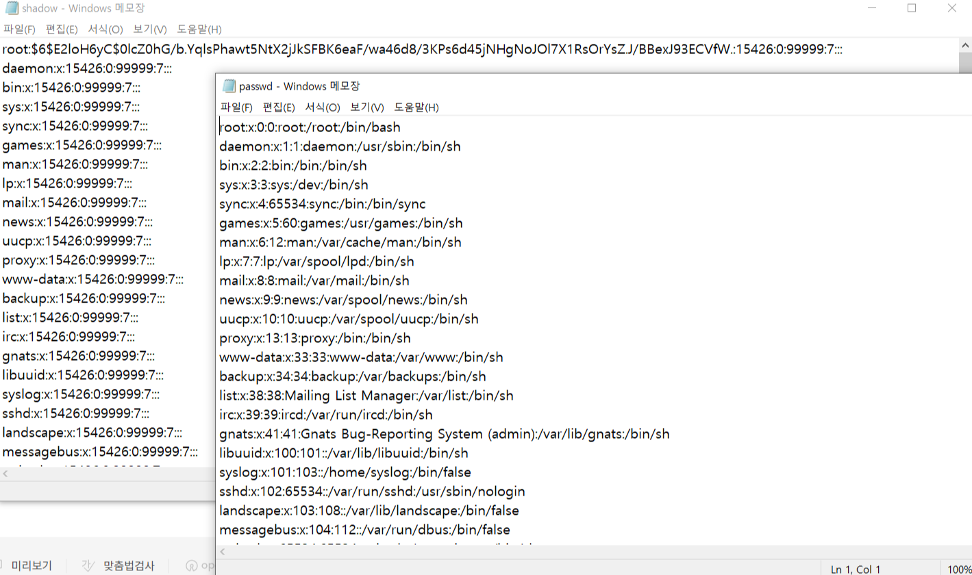 메모장으로 열어보니 다음과 같이 비밀번호가 나와있었다. 리눅스를 다뤄본 사람들이라면 알겠지만 passwd 파일에서 사용자이름:x:0:0~ 일 때 x가 되어 있는 이유는 shadow 파일이라는 곳에 비밀번호를 암호화해서 저장해놨기 때문인데, 그래서 내가 shadow 파일을 열었을 때 root 사용자 부분에 엄청 긴 비밀번호가 있는 것을 확인할 수 있다. 물론 이 비밀번호 전체가 정답은 아니고.. 솔트값,, 해시값이 포함된 것이다.