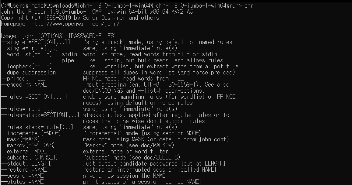 압축을 풀어서 run 폴더까지 들어간 뒤, john 명령어를 입력해봤는데 다음과 같이 사용법이 나왔다.