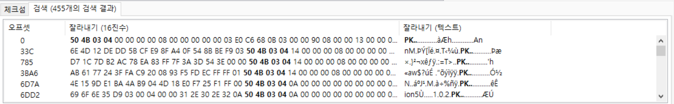 근데 50 4B 03 04 로 시작하는 부분이 455개나 있단다;