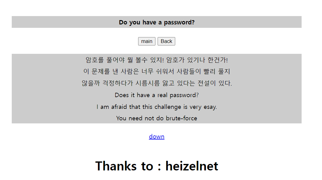 brute-force를 사용하지 않고.. 암호를 풀어야 하는거 같다. 일단 파일을 다운로드 받아 압축을 풀어보자.