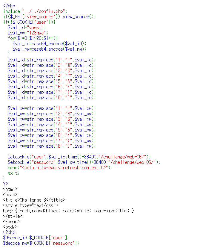 일단 base64 인코딩을 진행하는 코드 먼저 해석해보면 cookie 값이 user면,, id가 guest고 pw가 123qwe일때 i가 0부터 19될때까지 guest와 123qwe를 (즉 전부) base64 인코딩을 진행한다는 것.. 근데 그렇게 되면 인코딩을 20번이나 한다는건가..! 이건 파이썬 자동화 코드를 또 사용해야 하는거 같다. 결국 지금 이 페이지에 있는 쿠키값은 guest, 123qwe 인거고, 실제 정답은 admin,nimda인거 같다.