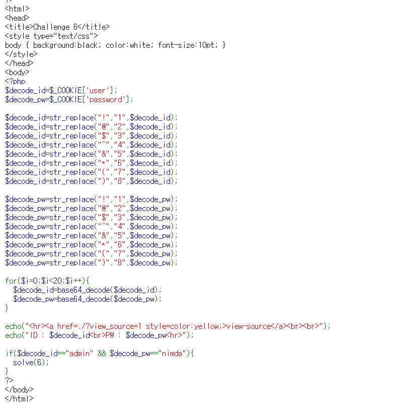 view_source 아래 부분은 디코딩에 대한 내용이 적혀있고, $decode_id가 admin이고 $decode_pw가 nimda면 solve(6) 함수를 실행하는 것으로 보인다.