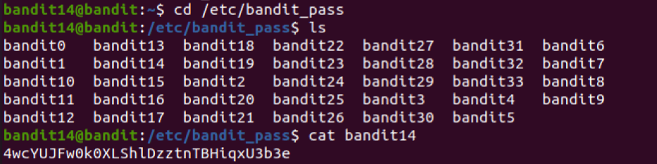 그리고 14단계로 넘어가면 /etc/bandit_pass/bandit14에서 내 비밀번호를 찾을 수 있다..