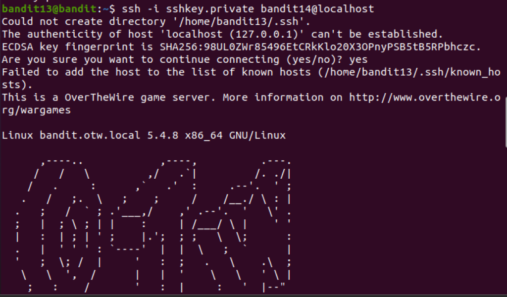 user bandit14만 읽을 수 있는 파일. /etc/bandit_pass/bandit14 (user banditN이면 그 해당 N레벨의 패스워드 파일만 읽을 수 있다는 뜻이다.)