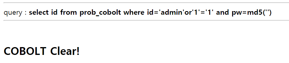 1번 Gremlin 문제와 다를건 없어보이는데 패스워드 부분이 md5('')로 조금 다르다. md5 암호화해서 저장한다는건지..는 모르겠고 사실 이 문제도 1번이랑 똑같이 풀면 풀린다.