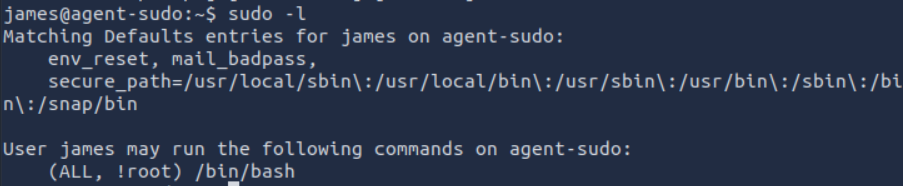 저 (ALL, !root) /bin/bash가 몰라서 구글에 검색해봤는데, CVE-2019-14287이라는 취약점이 있어서 혹시 이건가..? 싶어서 입력해봤는데 정답이다.