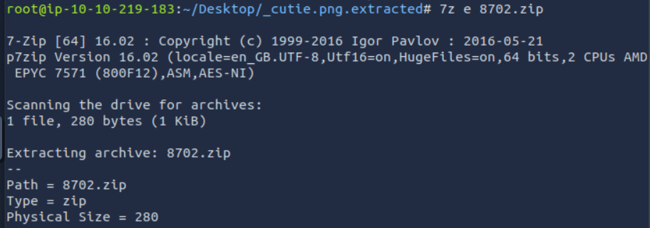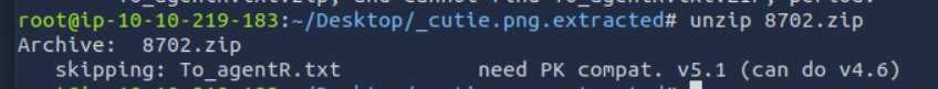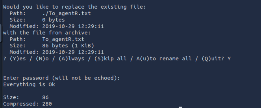일단 unzip 8702.zip의 압축을 해제하고 싶은데, skipping: To_agentR.txt라며 비밀번호 자체를 입력할 수가 없다. 검색해보니까 이런 경우는 7z으로 압축 해제를 하면 되는 것 같다.
