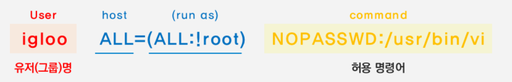 /etc/sudoers 파일에 이런식으로 설정을 해놓으면, 허용 명령어는 패스워드 없이 사용할 수 있다는 뜻이다.