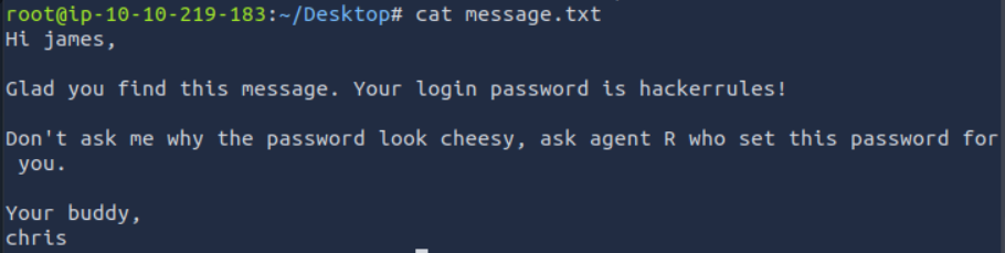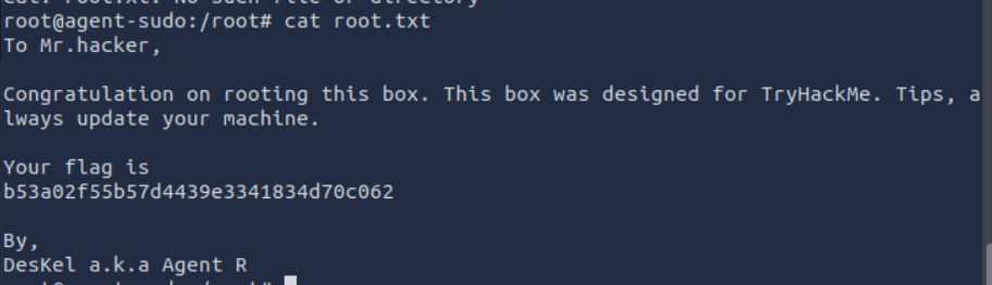 정답은 root.txt 파일의 맨 마지막 줄에 있다. Deskel a.k.a Agent R
