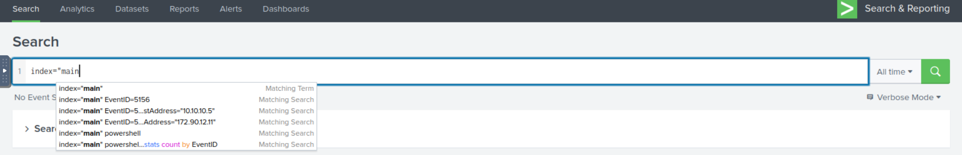 검색전, 오른쪽에 있는 검색 필터를 좀 바꿔줘야 된다. 시간은 All time으로, Mode는 Verbose로 해서 모든 이벤트를 분석하는 것이다.
