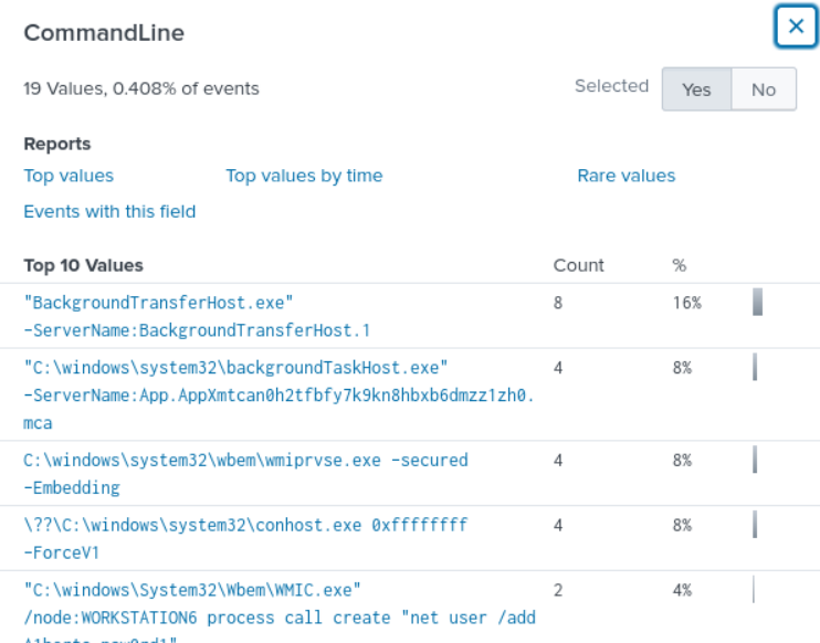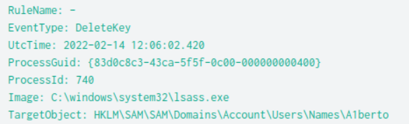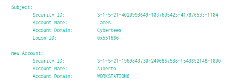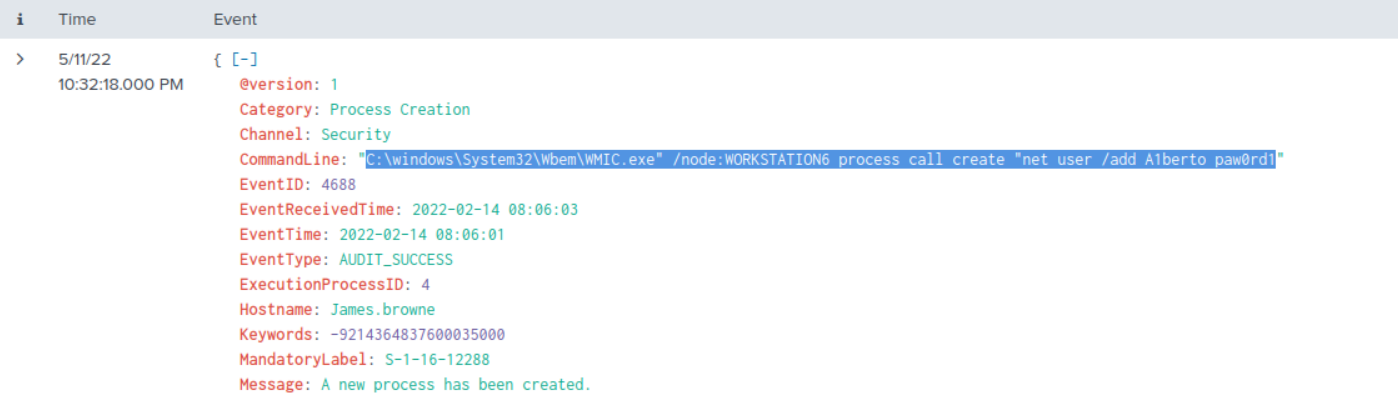 그중에서 Process Creation을 하는 이벤트가 있었고, CommandLine에는 net user 명령어로 A1berto 계정을 생성하는 명령어가 있었다!