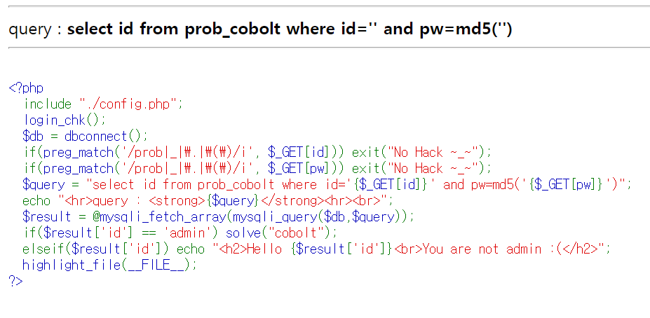 1번 Gremlin 문제와 다를건 없어보이는데 패스워드 부분이 md5('')로 조금 다르다. md5 암호화해서 저장한다는건지..는 모르겠고 사실 이 문제도 1번이랑 똑같이 풀면 풀린다.