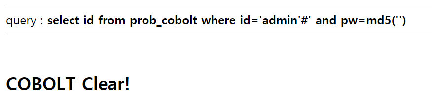 그럼 admin'까지는 그대로 해석되고 #뒤인 ' and pw=md5('')는 다 무력화 됨.