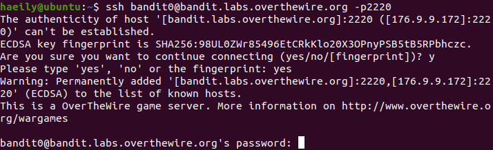 username = bandit0이니까 bandit0@bandit.labs.overthewire.org 입력해주고, 뒤에 포트번호까지 적어준다. 아래 'The authenticity of host~' 이 부분은 어떤 특정 호스트에 최초로 ssh 접속을 하면 뜨는 것이라는데 잘 모르겠으니 일단은 yes 입력하고 넘어갔다. (크게 중요한 건 아닌 듯) 그리고 'This is a OverTheWire game server.' 밑에 password 칸이 뜨면 비밀번호 bandit0 입력!