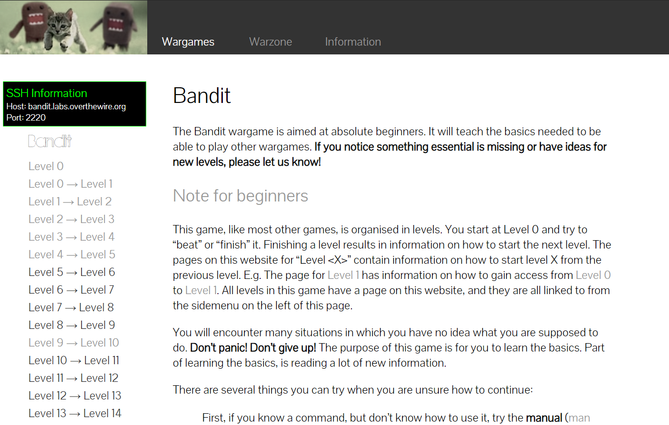 We're hackers, and we are good-looking. We are the 1%. Wargames The wargames offered by the OverTheWire community can help you to learn and practice security concepts in the form of fun-filled games. To find out more about a certain wargame, just visit its