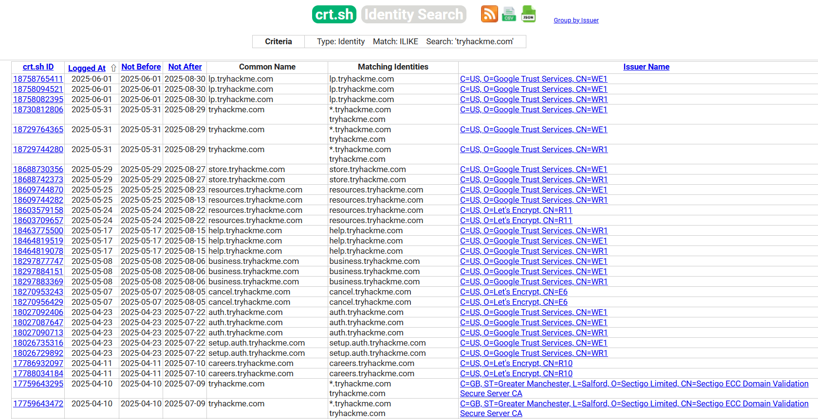 이런 투명성은 악의적, 또는 실수로 발급된 인증서가 사용되는 것을 막기 위함. 그래서 이 서비스를 활용하면 특정 도메인에 속한 서브도메인들을 찾아낼 수 있음.
