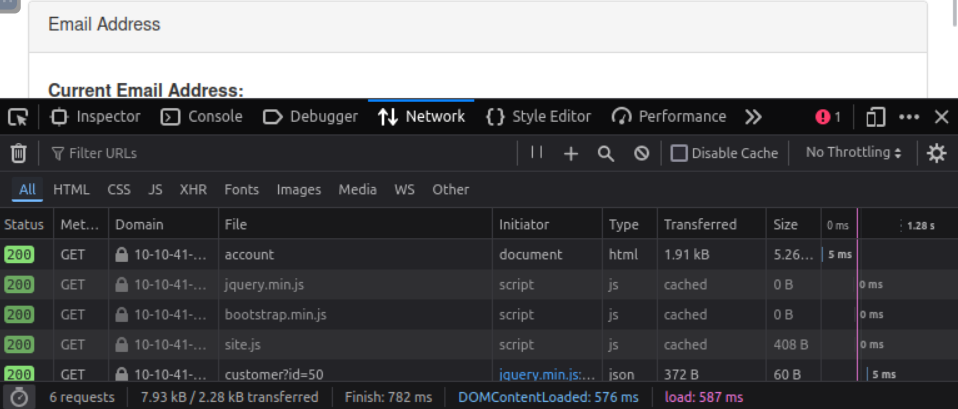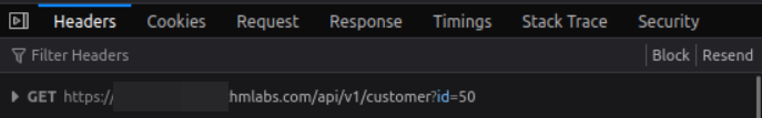 customer?id=50을 클릭해봤다. 내 id=50이라는 뜻.. 보면 /api/v1/customer?id={user_id} 경로를 가진 엔드포인트로 GET 요청이 보내지고 있다. 브라우저에 표시되는 사용자 정보는 쿼리 스트링의 id 파라미터로부터 가져오는 것임을 알 수 있음.