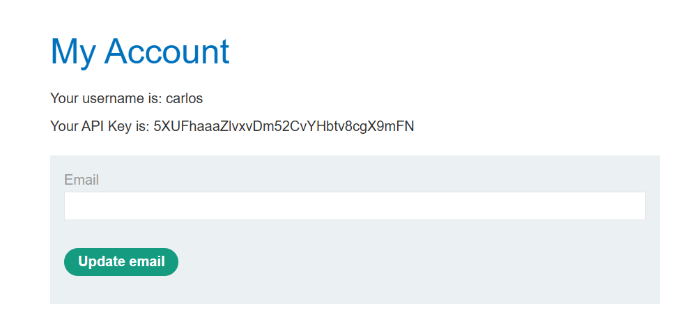 해당 링크에 적힌 id 값을 my account 페이지로 이동해 url에 적힌 내 id를 carlos의 id로 변경하면 carlos account로 이동해 API Key를 얻을 수 있다.