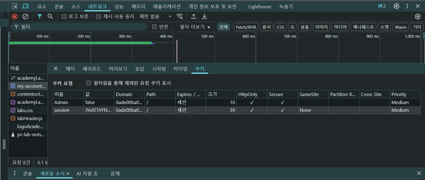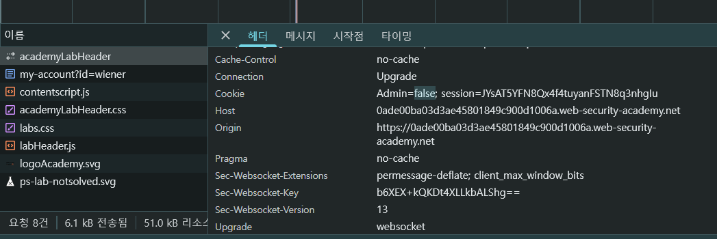 이 academyLabHeader에도 cookie 값에 admin=false인 것 확인 PortSwigger Web Security Academy에서 페이지 상단에 표시되는 헤더 UI 구성 파일이라 이건 무시해도 됨..