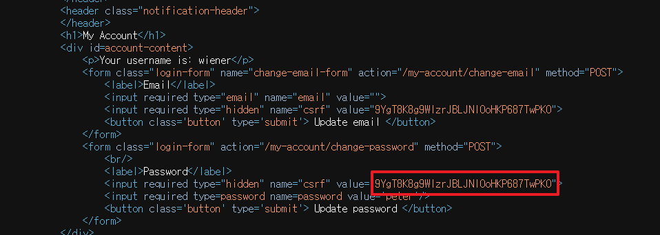 저 hidden 타입의 csrf value가.. 비밀번호인가보다.