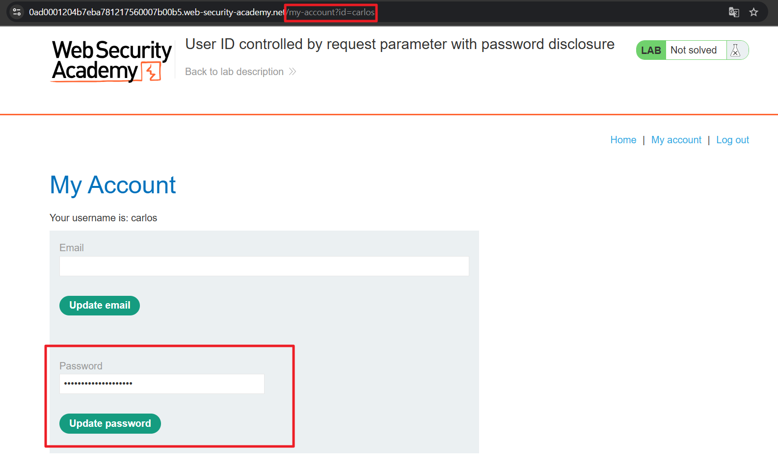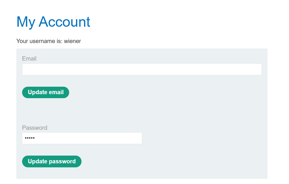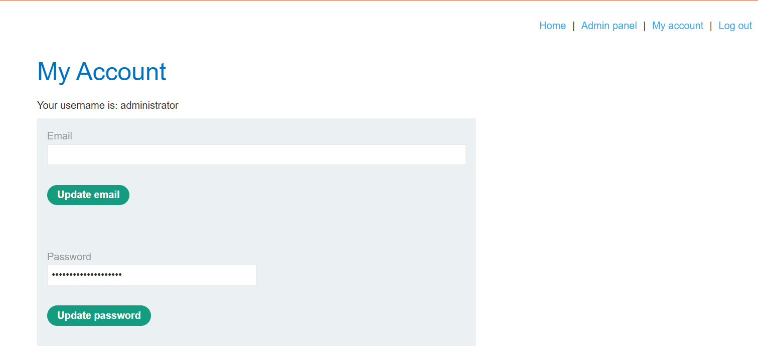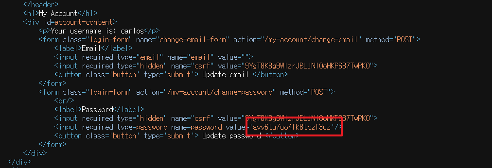 account page에 가면 패스워드가 masked input, 즉 가려서 표시될 것이다. admin의 패스워드를 알아내고 carlos 계정을 삭제하는 것이 목표다.