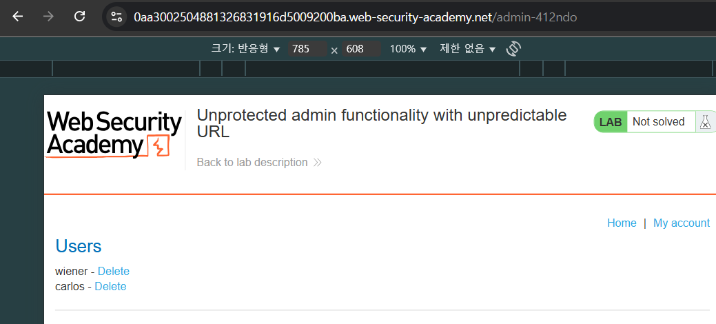 /admin으로 접속이 가능하고, carlos 계정을 삭제할 수 있다.