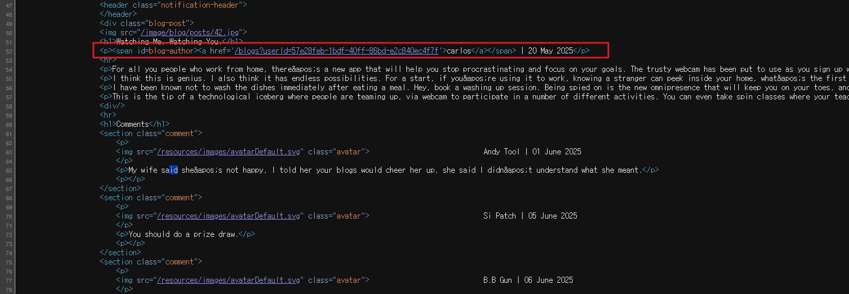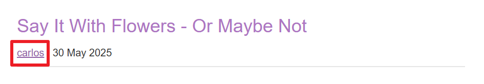 carlos가 쓴 blog post를 찾아서 그의 ID가 포함된 URL 정보를 습득하고, 그 암호로 account 페이지에 로그인을 하면 된다고 한다. 그 id 파라미터 값을 저장된 user ID로 변경하면 API Key 값을 찾을 수 있다.