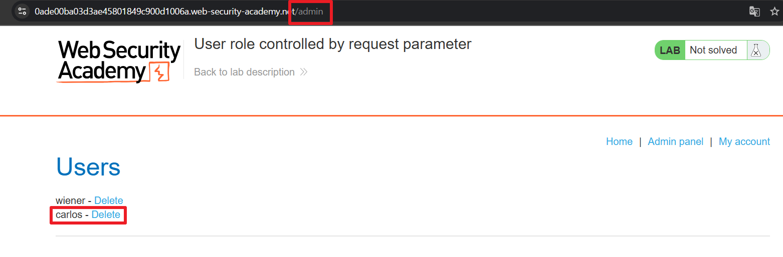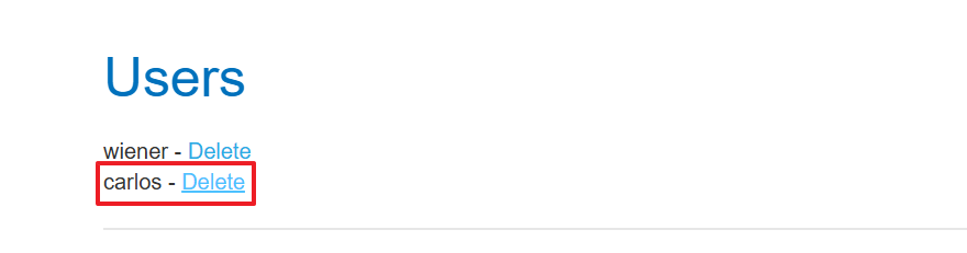 admin panel로 접근 가능해서 carlos 계정을 삭제했다.