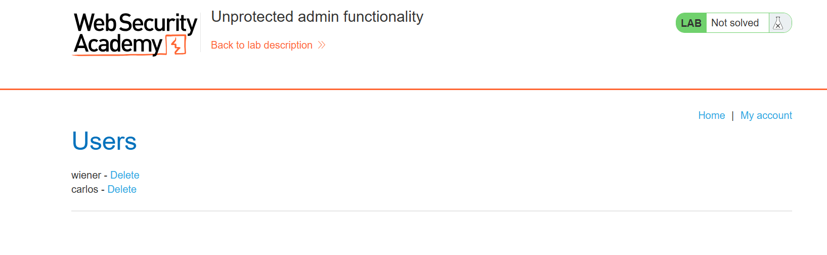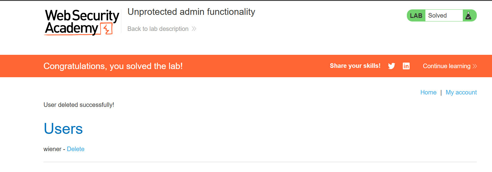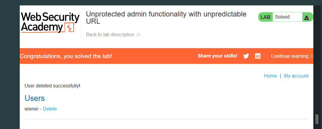 carlos 계정을 지웠더니 다음과 같이 LAB solved 완료.