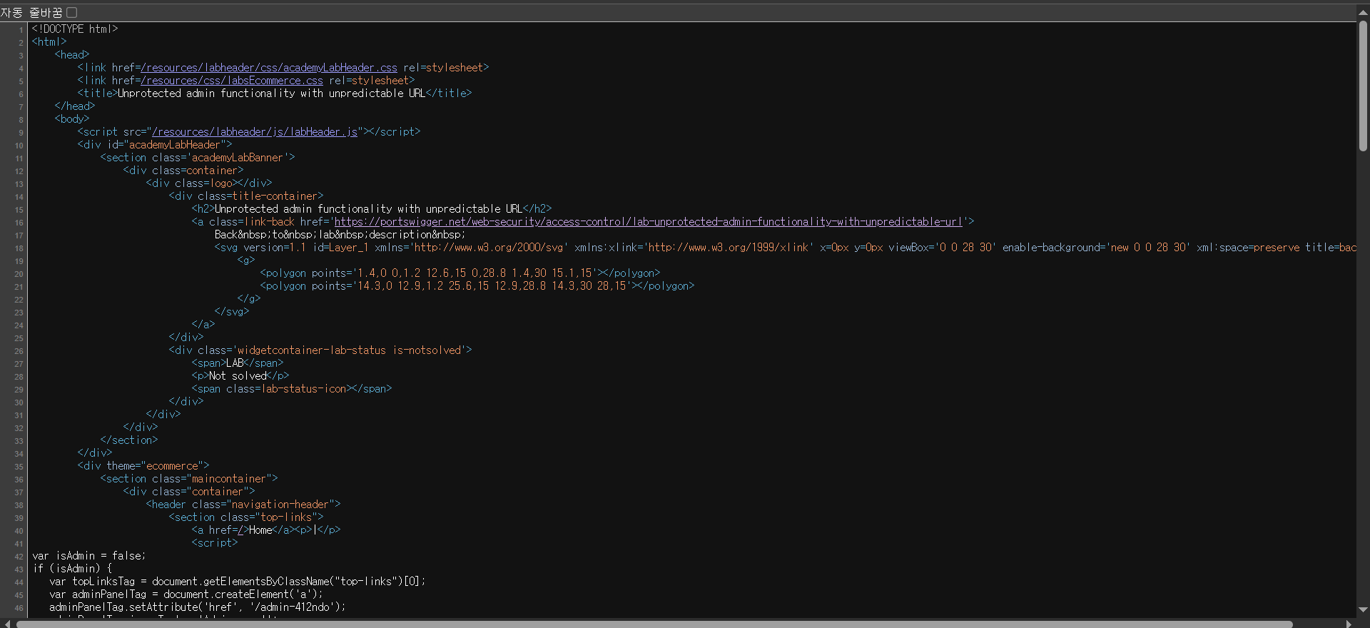 홈페이지 소스코드에서 관리자 url을 찾고, 그 url을 열어서 carlos를 삭제하는 것. 위에서 진행한 lab과 동일한 것이지만 방법이 조금 다르다. 내가 그 url을 찾아내는 것이 문제