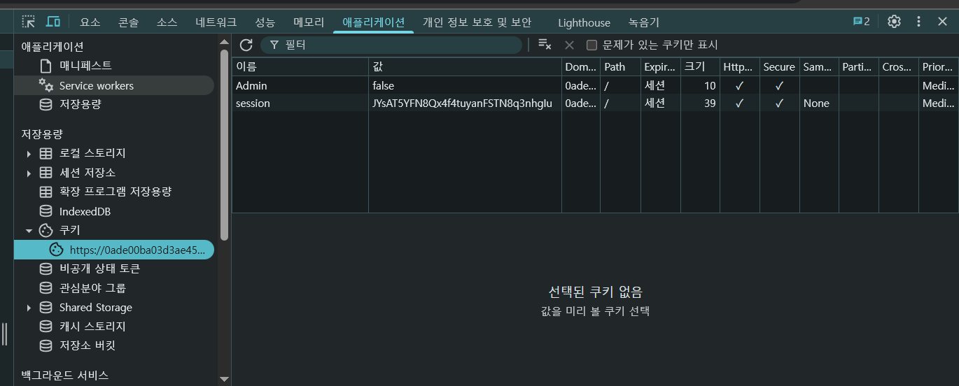 애플리케이션 탭의 쿠키로 가면 아까와 같은 cookie 값들이 있는 것을 확인할 수 있다. 여기서 admin의 false값을 true로 변경해주면 된다.