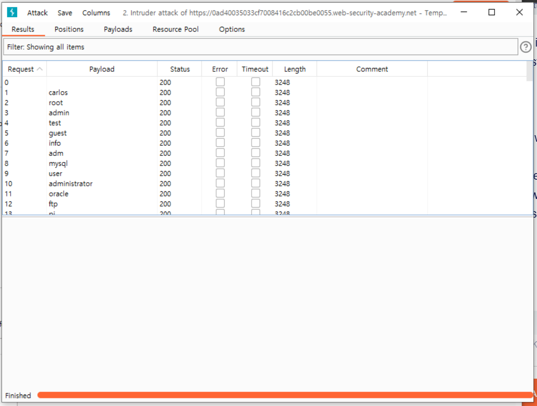그리고 실습에 제공된 wordlist를 활용해서 intruder로 brute-force 공격을 하면 되는데, 한번도 해본적이 없어서 해당 실습 페이지 내에 있는 solution의 힘을 빌렸다.