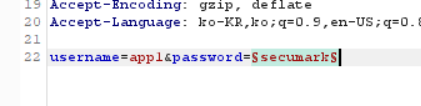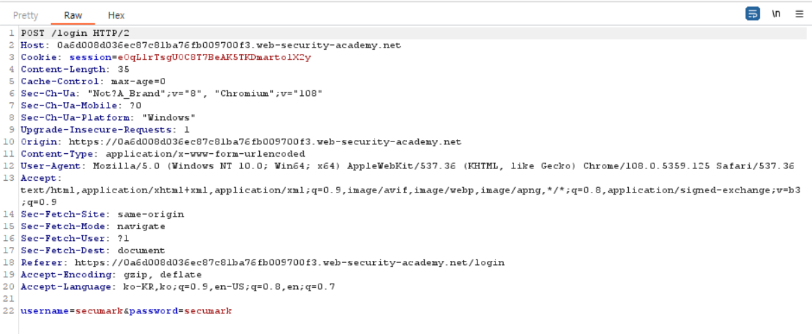 POST /login HTTP /2로 요청 헤더가 시작되고 있어 username과 password는 body 부분에 들어가는 것을 확인했다.