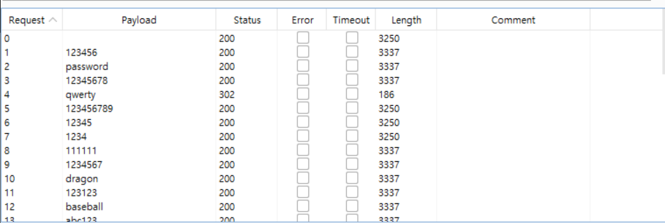 payload options에 비밀번호 wordlist를 넣어두고 공격을 하면