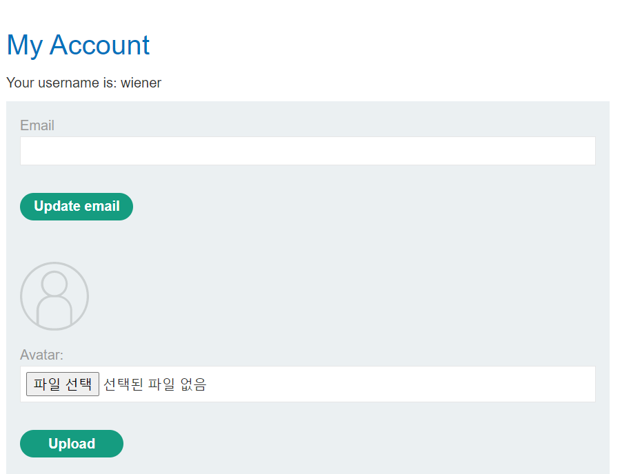 wiener 계정으로 로그인하니 my-account 페이지에서 avatar에 이미지 파일을 선택해 업로드할 수 있다.