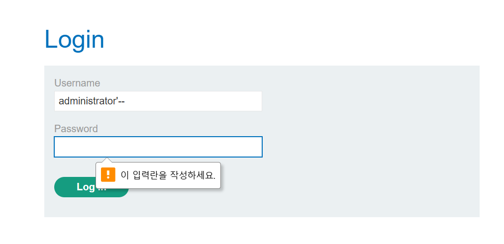 다음과 같이 --' 이후로는 모두 주석처리되어 무시되고 비밀번호 체크 없이도 administrator 사용자 정보만 조회해 관리자 계정으로 로그인할 수 있게 된다. (Authentication Bypass)